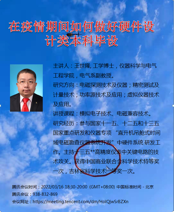 当前长春市新冠肺炎疫情爆发突然、来势凶猛,防控形势异常复杂严峻。为更好解决2022届毕业同学在封校期间做毕业设计所提出的问题、疑惑等情况,公司举办里疫情期间系列线上专题讲座。2022316日,由我公司副教授王世隆老师针对“在疫情期间如何做好硬件设计类本科毕设”问题进行讲解。会议由教学副经理刘长胜教授主持,参与会议的有毕业设计的指导教师和2018级的同学200余人。