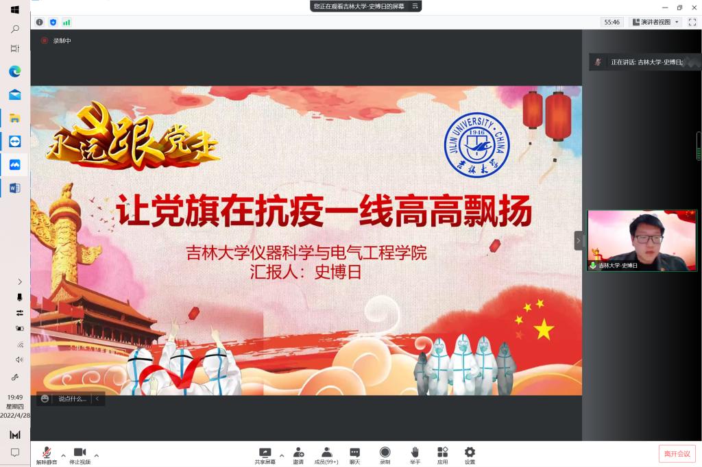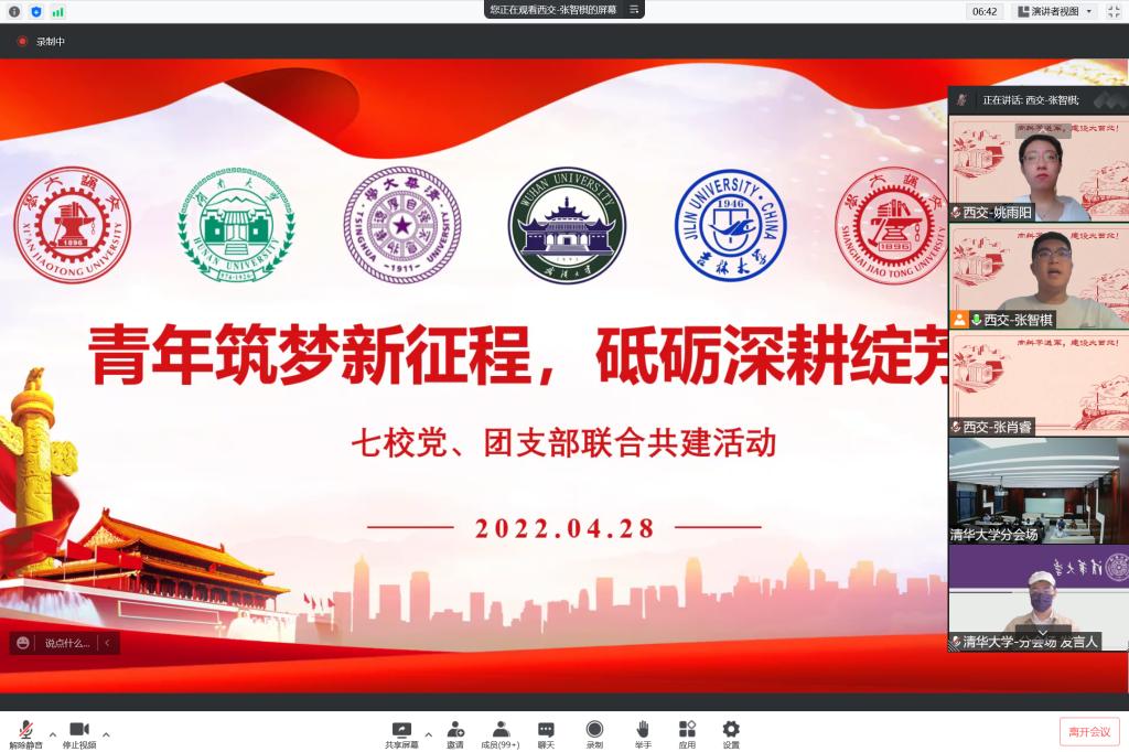 2022年4月28日晚,联合开展青年筑梦新征程,砥砺深耕绽芳华”党团共建系列活动在腾讯会议线上举行,次活动由西安交通大学主办,来自西安交通大学、湖南大学清华大学、武汉大学、yl23455永利上海交通大学、浙江大学七所的党员参与其中党委副书记副经理周伟老师测控本科生党支部书记马姗姗老师出席活动