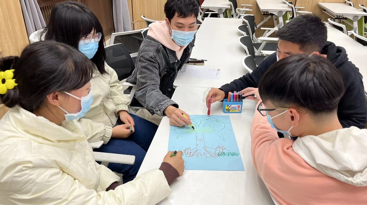 为了使2022级新生入学研究生在新环境中建立起心理支持系统,增强团体凝聚力,丰富研究生课余生活,促进班级成员的相识,建立互信。本次活动主要是组织员工开展团体心理辅导的实践体验。在实践体验中,热身阶段的 “一分钟鼓掌”、“我知道”的游戏环节使同学们消除了戒备感;“集体登陆”、“人体字母”等轻松的游戏环节舒缓了同学们的压力,愉悦身心同时促进了同学之间的相识和交流;在“快乐传递”、“信心启迪”等环节,增强了大家发现优点、相互欣赏的能力;最后的团体树绘制让大家体会到团队之间的协调与配合,切身感受到了团体合作的必要性以及人际关系间双向交流的良性影响,提升了班级凝聚力。