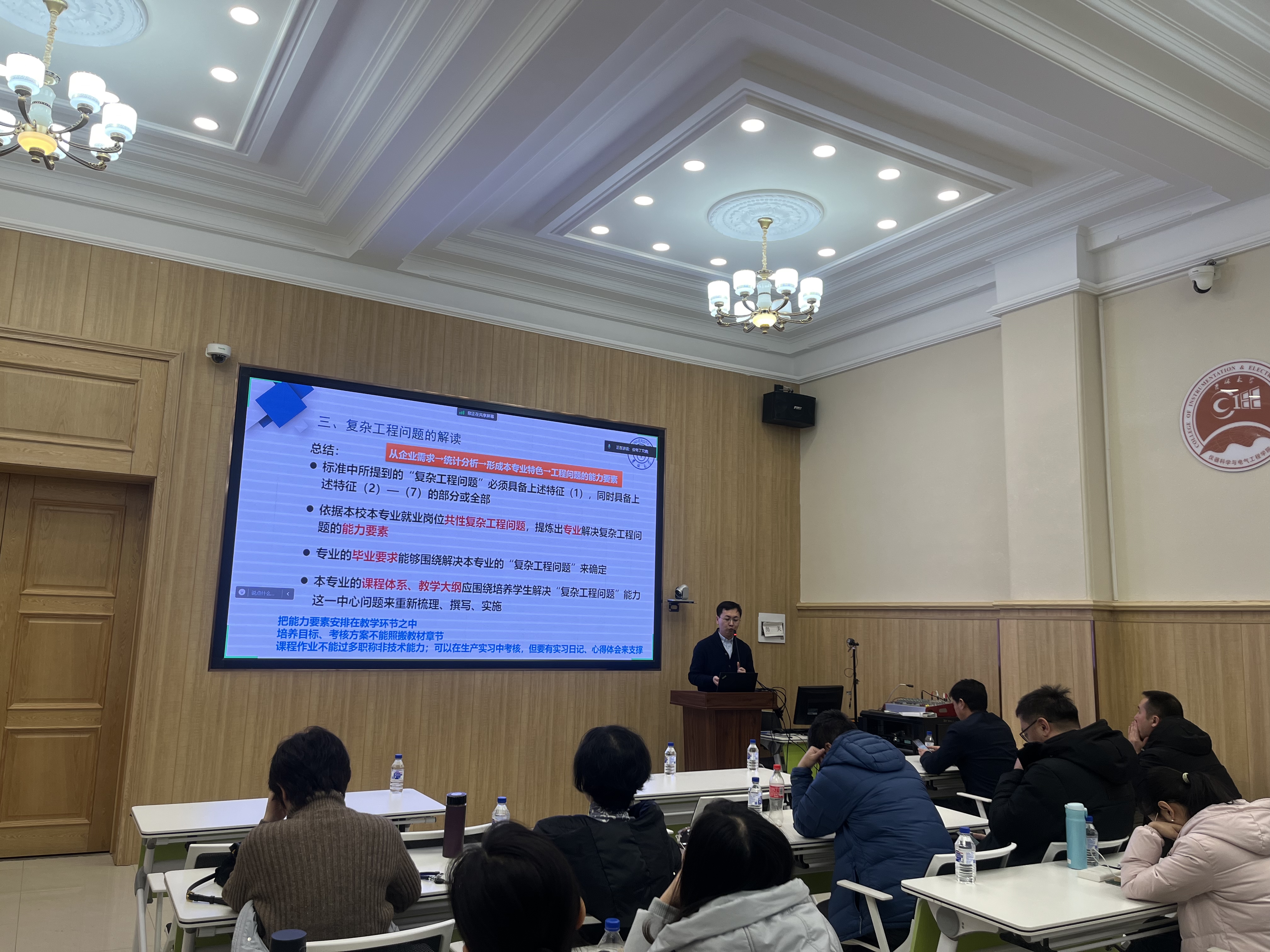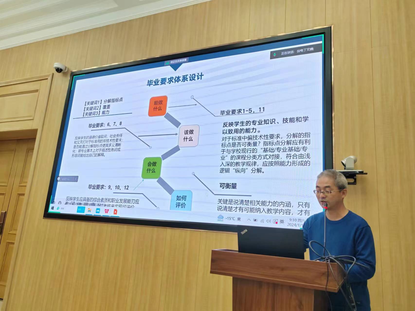 随后,朱杨老师主要介绍了复杂工程问题的教学设计,他指出,(1)要在标准和公司的实际情况之间找到平衡点,做好专业特色发展;(2)课程体系、教学大纲应围绕解决“复杂工程问题”的能力来重新梳理;(3)课程目标、考核方式也要能检验解决“复杂工程问题”的能力。高喆老师分享了自评报告撰写案例分析,详细解读了员工项、培养目标项、持续改进项、课程体系项、团队队伍项以及支撑条件项的经典案例。他强调,培养目标要公开、符合公司定位、适应社会经济发展需要,立足培养德智体美劳全面发展的社会主义事业合格建设者和可靠接班人。丁文晴老师针对专业认证的做与改进行分析,强调了专业认证要以成果为导向,持续改进。同时,牢牢把握专业认证的关键点,围绕“课程目标达成评价”和“毕业要求达成评价”,详细介绍了自评报告、申请书以及中期报告的书写要求。