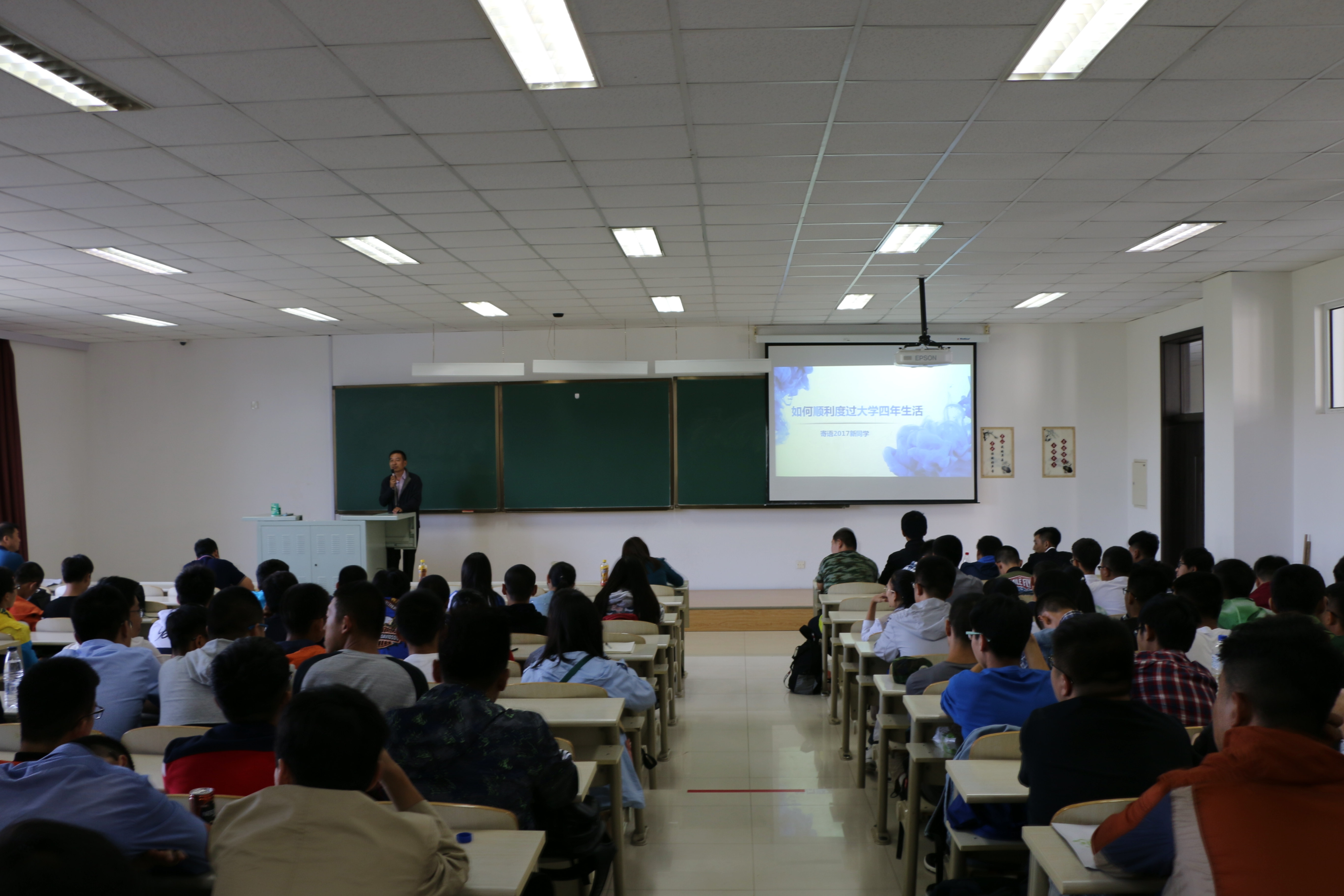 讲座伊始,王书记首先为新生展望了一下四年后可能的五个结局——毕业、考研、出国、淘汰、不能正常毕业。论及原因,王书记讲到大学是一场长跑,这四年时光,有的人一开始就踏上了其他跑道,也有人挤到了前面的队伍,是时间让大家变得不一样。之后王书记又以毕业季中沉睡的老员工为切入点列举了大学期间部分老员工自理能力不强、没有自主学习能力荒废时间的现象。同时又以现在的学费和生活费算下来每一天的花销在60元以上来激励员工不要浪费时间也不浪费父母的金钱。随后王书记又列出了大学期间必须要做的几件事,为大一新生的大学之路指引了方向,同时也强调了良好习惯的重要性。最后,王爱民书记讲到,“用知识改变命运,用勤奋播撒希望,用激情创造价值,用实力创造未来”,借此表达了对2017级新生的勉励,也对新生表示了极大的期许。