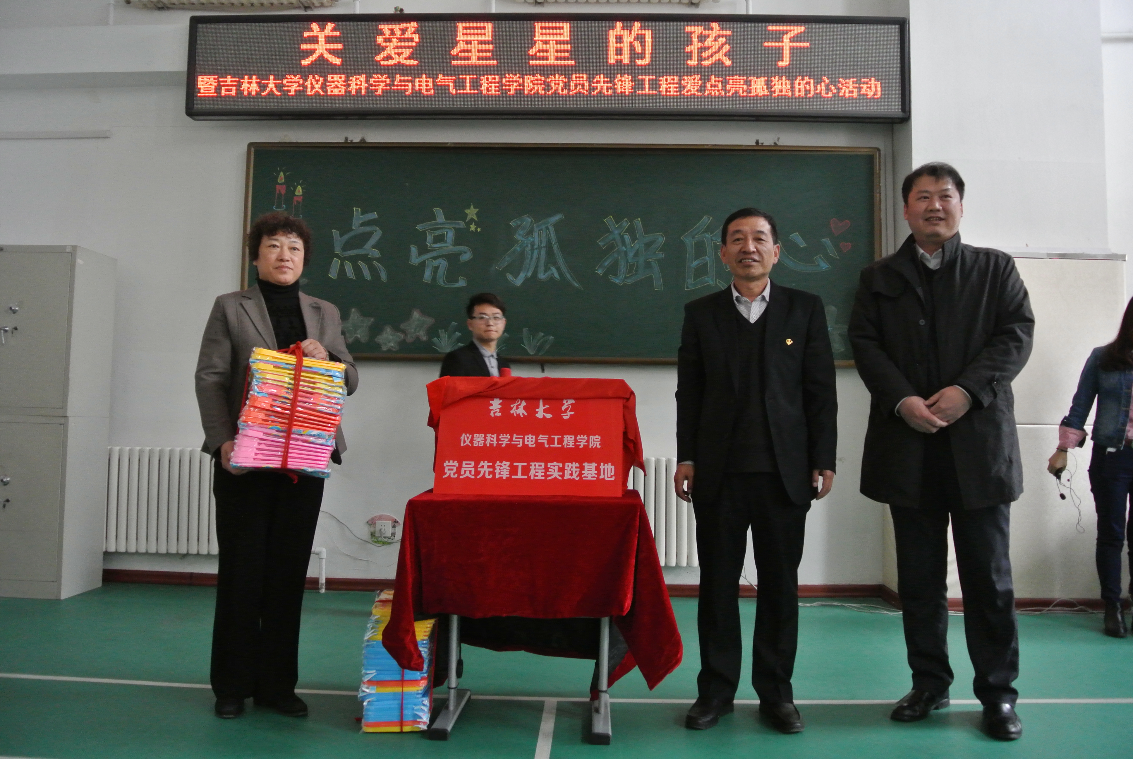 活动上,长春市南关区育智公司董事长左桂荣,yl23455永利公司党委书记王爱民共同为yl23455永利公司党员先锋工程实践基地揭牌;党委书记王爱民、副书记邱增凯为南关区育智公司的同学们赠送了精心准备的特制画板。