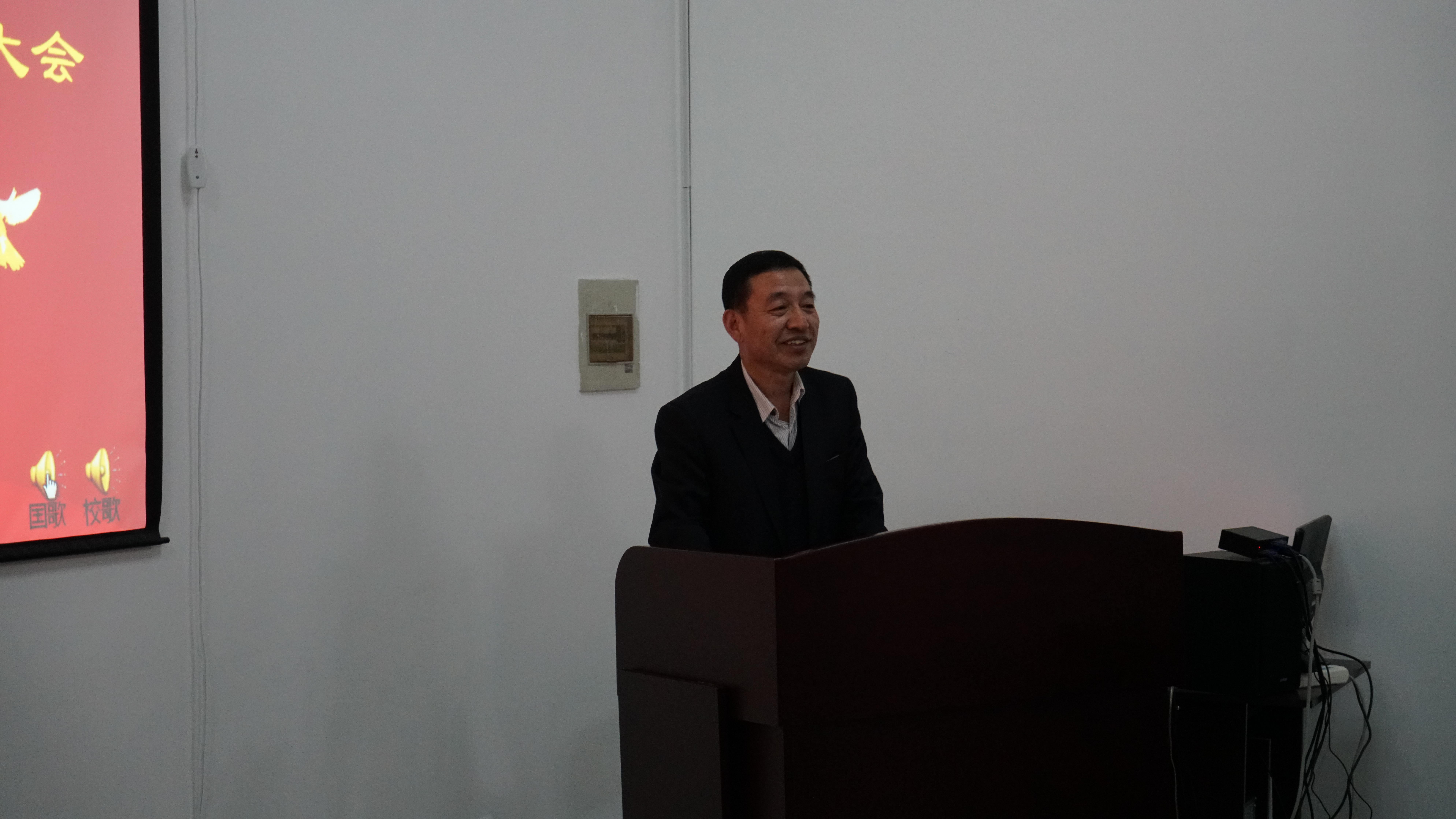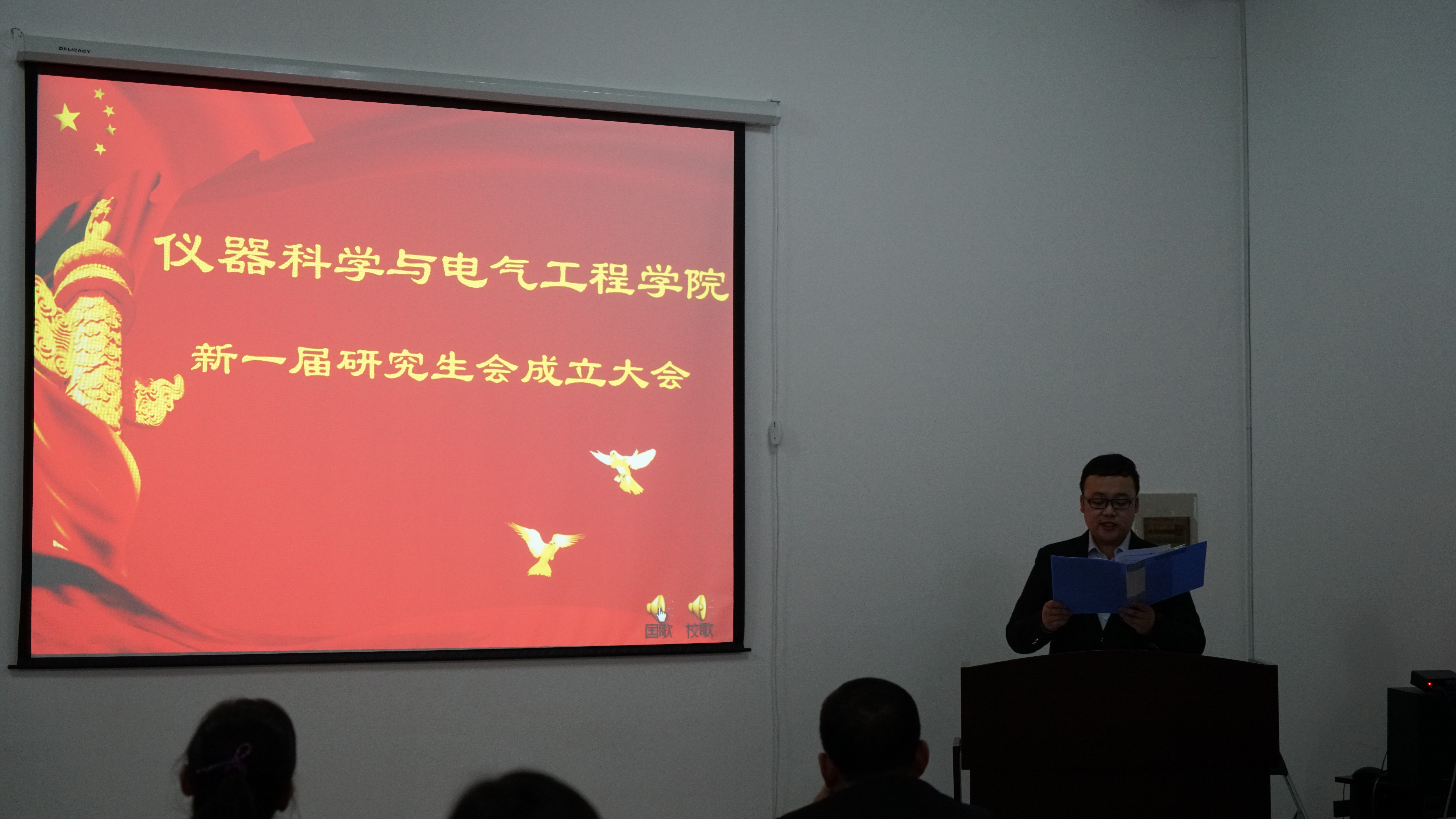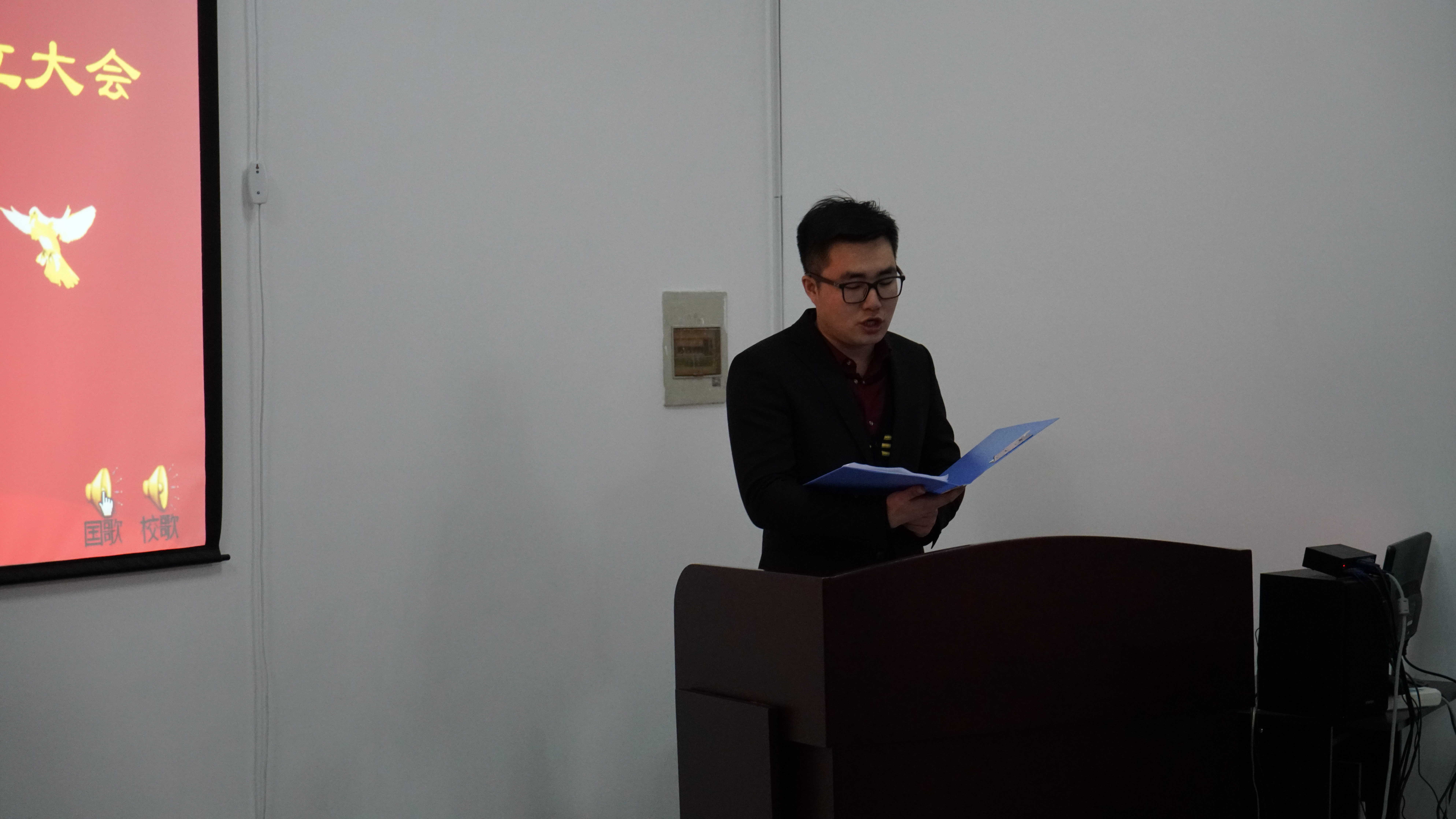 公司党委书记王爱民、副经理嵇艳鞠、党委副书记邱增凯和院团委书记张昊宇出席成立大会。下午1:30分,伴随着雄壮激昂的国歌声,会议在公司党委副书记邱增凯老师的主持下拉开序幕。