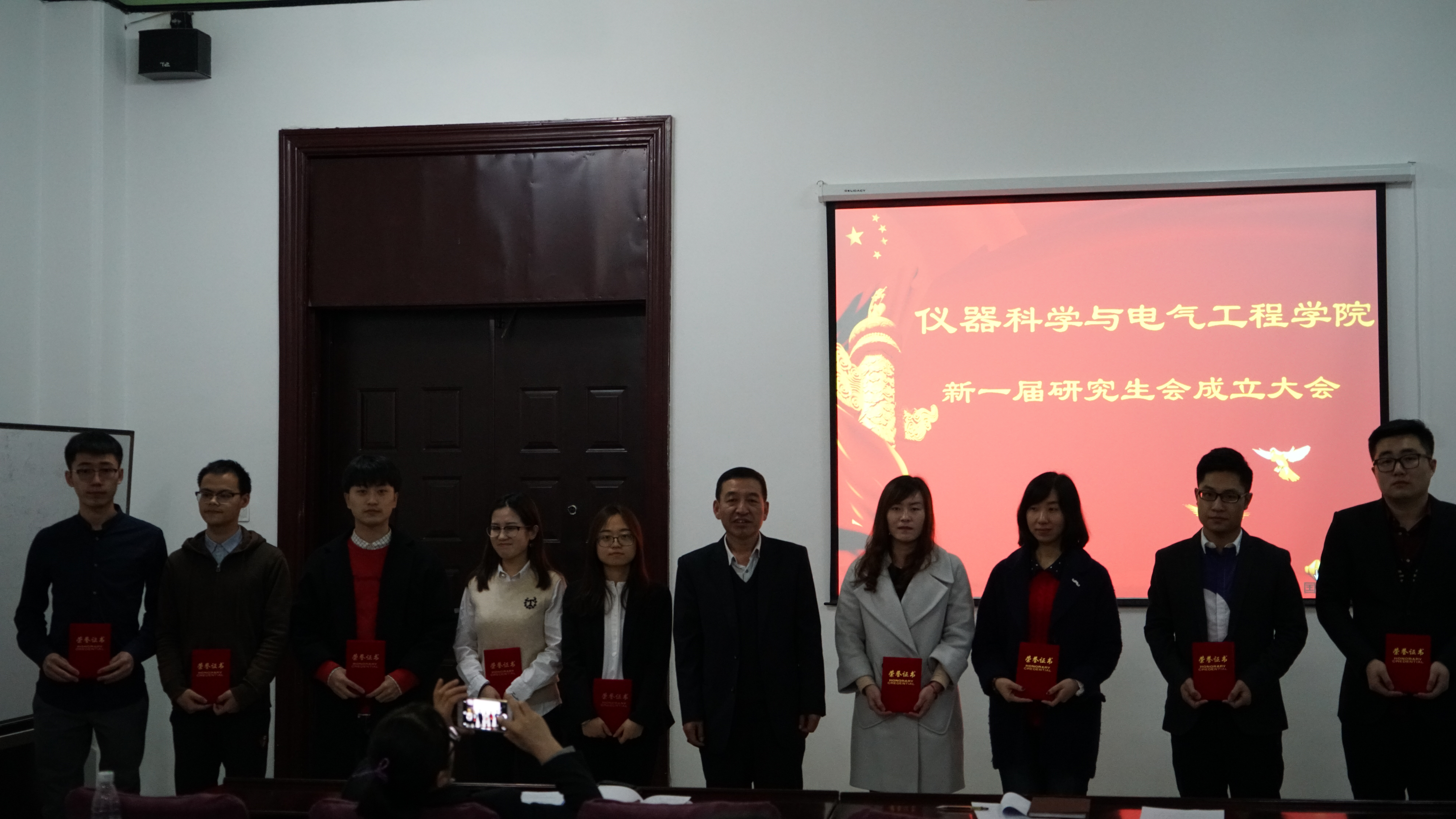 张昊宇老师宣读了《yl23455永利研究生会章程》,章程从研究生会总体性质,会员要求,会员权利,部门构成及职责,主席团构成及职责,研究生会规章制度等几个方面出发,系统全面的为全体与会成员介绍了研究生会的基本情况,明确了研究生会在公司研究生工作开展中的重要性、崇高性与关键性。随后,副经理嵇艳鞠教授宣读新一届研究生会主席团成员名单,其中,任命黄维宁同学为研究生会主席,韩哲鑫同学为研究生会常务副主席。宣读完毕,嵇经理对成功当选的九位员工干部表示热烈祝贺并简单表达了自己对研究生会工作的深切期望。在王爱民老师为九位主席团成员颁发聘书后,黄维宁同学作为主席团成员代表上台讲话。话语中既有对组织信任委以要职的感恩之情,又有代表全体研究生会成员坚定锐意进取,埋头苦干品质的壮志之心,他从制度建设和活动筹划两个角度展望了今后工作,并提出了“完善自我,树立标杆”的工作追求,为研究生会工作绘制了宏伟蓝图。