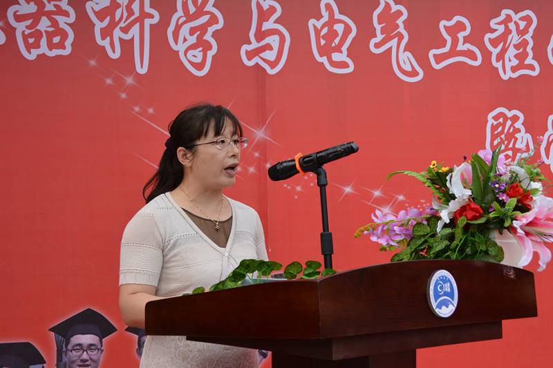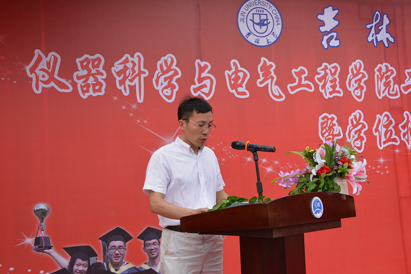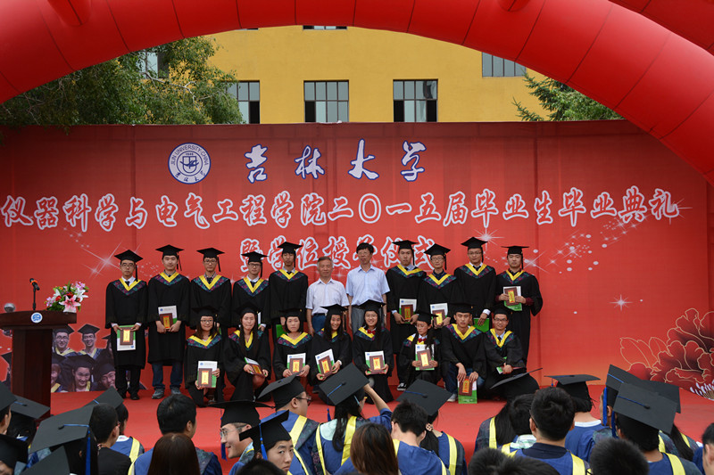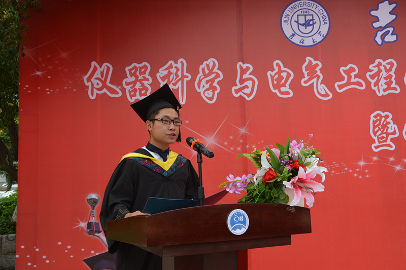 毕业典礼在庄严的国歌声中拉开序幕。首先,副经理嵇艳鞠教授、陈祖斌教授分别宣读了2015届研究生毕业生和本科毕业生名单,经理林君教授与院学科学位委员会副主席嵇艳鞠教授一起为2015届毕业生授予学位。随后,公司党委书记余国友教授宣读了2015届校优秀毕业生名单,并为优秀毕业生颁发获奖证书、合影留念。公司教学委员会主任王应吉教授宣读了优秀毕业论文名单,仪器系主任凌振宝教授、电气系主任刘长胜副教授分别为获得优秀毕业论文的同学颁发证书并合影留念。之后,教师代表王应吉教授和2015届毕业生代表、2014年度自强自立老员工标兵韩哲鑫同学分别作了发言。王应吉教授代表公司全体教师对2015届毕业生送上了最诚挚的祝福,希望大家在今后的事业中取得更大的成就。韩哲鑫同学代表公司全体毕业生向辛勤培养自己的母校,向仪电公司,向四年以来关心、帮助大家的领导和老师们表示了衷心的感谢和良好的祝愿。