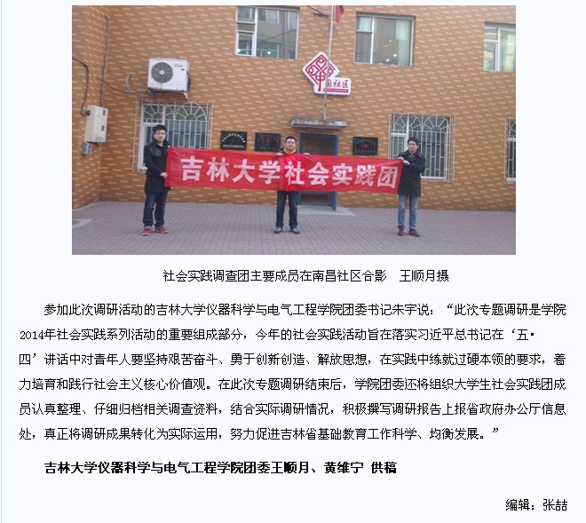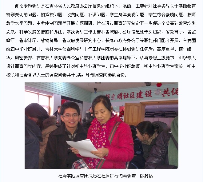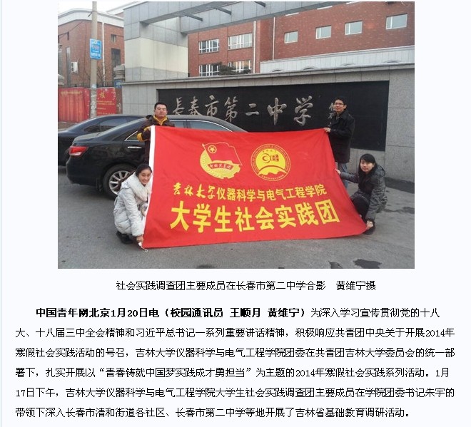 为深入学习宣传贯彻党的十八大、十八届三中全会精神和习近平总书记一系列重要讲话精神,积极响应共青团中央关于开展2014年寒假社会实践活动的号召,进一步发挥社会实践活动在加强和改进老员工思想政治教育中的积极作用,着力培育和践行社会主义核心价值观,yl23455永利团委组织开展了以“青春铸就中国梦实践成才勇担当”为主题的寒假社会实践系列活动。其中,2014年1月17日,yl23455永利老员工寒假社会实践团在院团委书记朱宇带领下开展的吉林省基础教育调研活动受到了共青团中央主办的中央重点新闻网站——中国青年网的关注报道,中国青年网于1月20日以《吉大学子寒假开展吉林省基础教育调研》为题做了详细介绍。