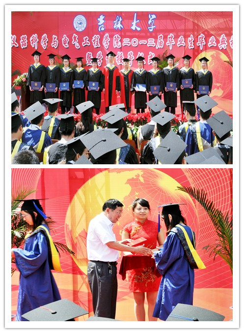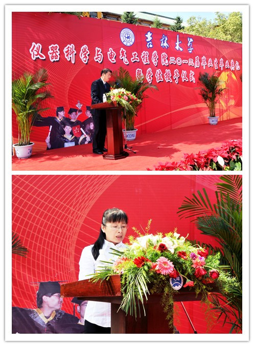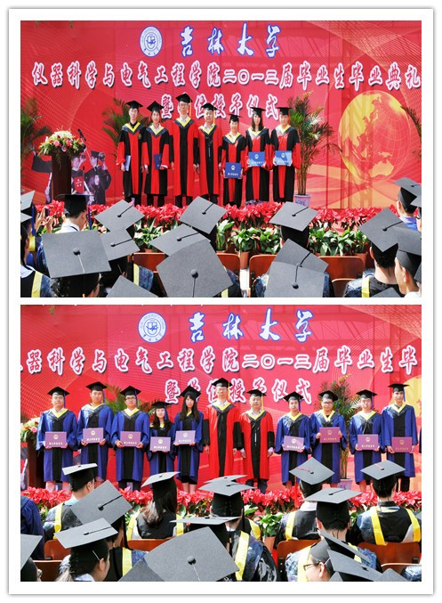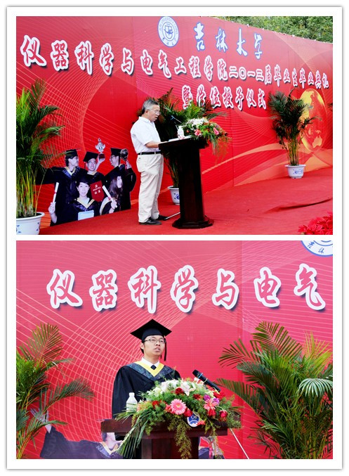 毕业典礼在庄严的国歌声中拉开序幕。首先,副经理嵇艳鞠教授、陈祖斌教授分别宣读了yl23455永利2013届研究生毕业生和本科毕业生名单,经理林君教授与院学位委员会主任田地教授一起为2013届毕业生授予学位。随后,公司党委书记余国友教授宣读了2013届校、院优秀毕业生名单,并为优秀毕业生颁发获奖证书、合影留念。公司教学委员会主任王应吉教授宣读了优秀毕业论文名单,仪器系主任凌振宝教授、电气系主任刘长胜副教授分别为获得优秀毕业论文的同学颁发证书并合影留念。之后,教师代表朱凯光教授和2013届毕业生代表、yl23455永利2012年度十佳老员工王春泽同学分别作了发言。朱凯光教授代表公司全体教师对2013届毕业生送上了最诚挚的祝福,希望大家在今后的事业中取得更大的成就。王春泽同学代表公司全体毕业生向辛勤培养自己的母校,向仪电公司,向四年以来关心、帮助大家的领导和老师们表示了衷心的感谢和良好的祝愿。