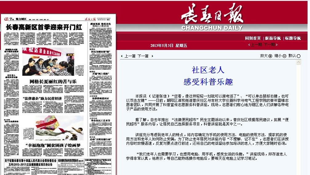 1. 长春日报《社区老人感受科普乐趣》http://ccrb.1news.cc/html/2013-05/03/content_309883.htm