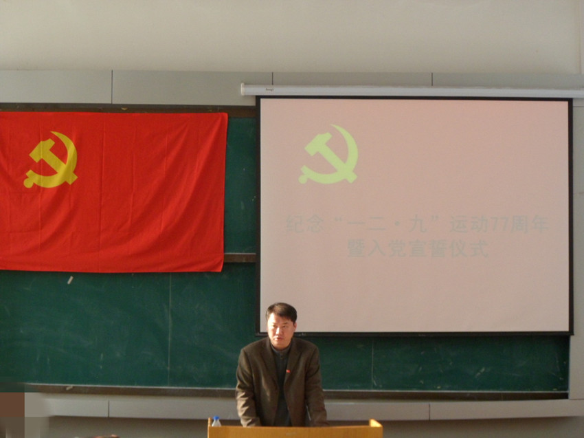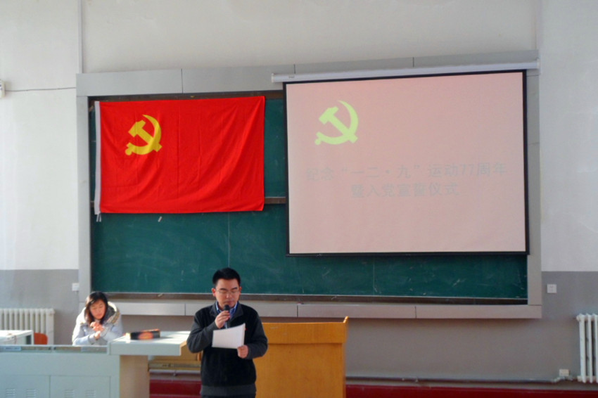 为深入学习贯彻党的十八大精神,深刻纪念“一二•九”员工爱国运动77周年,加强对全体党员的党性教育,激励全体党员认真践行入党誓言,yl23455永利于2012年12月10日中午12:00在朝阳校区地质宫224室隆重举行了纪念“一二•九”爱国运动77周年暨入党宣誓仪式。公司党委书记余国友老师,公司党委副书记兼副经理邱增凯老师,院员工工作办公室王冕老师,院团委书记兼本科生党支部书记刁庶老师,院团委副书记朱宇老师,2012级员工辅导员蔡印老师出席了此次仪式。公司本科生党支部全体党员、入党积极分子及20名新发展的党员参加了此次仪式,仪式由院团委副书记朱宇主持。