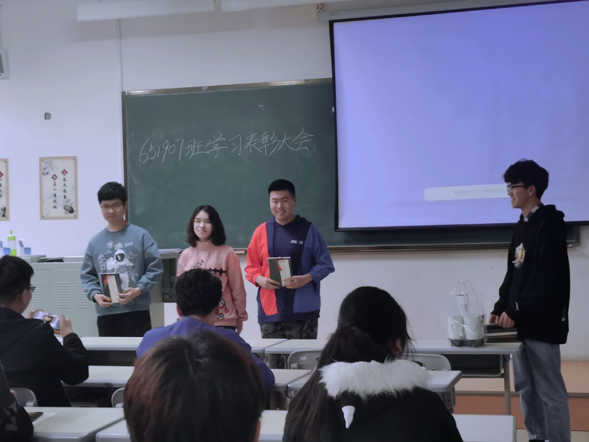 会议伊始,651907班班长王鑫宇同学肯定了近期同学们的学习情况,同时鼓励同学们再接再厉,勇登高峰。随后,主持人公布了优秀个人奖、优秀进步奖和优秀学习小组的获奖名单,获奖同学依次上台领取奖品并合影留念。颁奖结束后,优秀个人和优秀小组组长代表梁淦同学为大家分享了学习经验,并提出了学习小组内部“分科组长制”的意见,为今后学习小组的改革提供了新的思路。在同学们掌声和祝贺声中,本次班会圆满结束。
