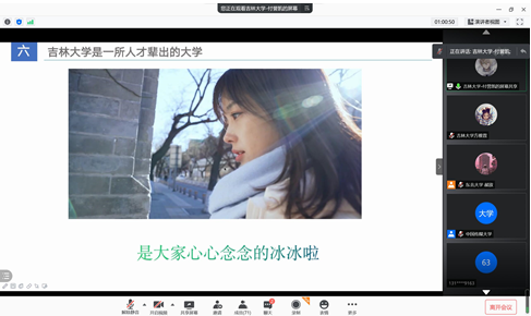 由于国内疫情形势突然紧张的原因,宣讲活动从线下更改为线上,但这丝毫没有打消宣讲同学的积极性和高中学子们的热情。首先,宣讲同学在线上为同学们播放了yl23455永利的宣传影片,同学们为吉大悠久的建校历史、深厚的红色文化、浓郁的学术氛围等所深深触动,组织同学们观看的现场不断爆发出掌声。