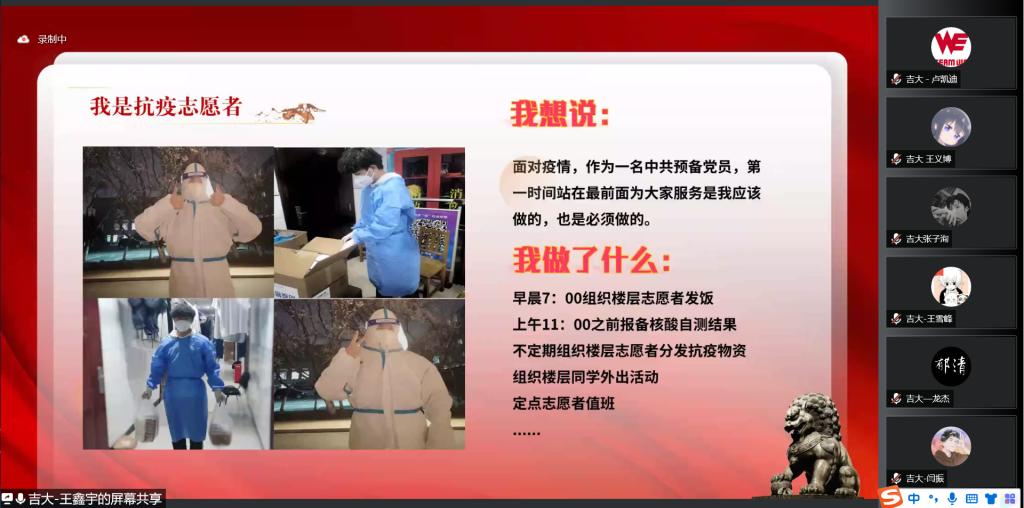 会议开始,东南大学彭袁圆老师对yl23455永利的支持表示感谢,向与会同学们致以亲切的问候。随后在东南大学仲点石老师带领下,与会成员共同学习习近平总书记在庆祝中国共产主义青年团成立100周年大会上的重要讲话精神,激励同学们增强勇担时代重任的光荣感、责任感、使命感,号召同学们汲取智慧提振信心为实现中华民族伟大复兴中国梦贡献力量深入学习习近平总书记的重要讲话后公司抗疫志愿者代表分享广大师生在抗疫过程中的先进事迹和宝贵经验。郝毅、王鑫宇、赵梦珂、胡玮桐同学分别从个人和集体两个角度出发分享了在校园封闭管理期间的抗疫日记志愿服务经历吉大学子守望相助、封校不停学员工党员积极投身防疫一线践行着新时代青年的初心与使命。听完yl23455永利同学的分享东南大学党团支部员工代表分享他们的抗疫事迹。精彩的发言与分享让与会的同学们再一次感受到了战“疫”之下青年人的奋斗与担当。围绕会议主题参会同学展开了热烈的讨论员工代表纷纷表示中国共青团成立100周年是历史性的一刻,青年一辈是时代的见证者,也是时代的参与者,要牢记使命,努力奋斗,回报祖国。