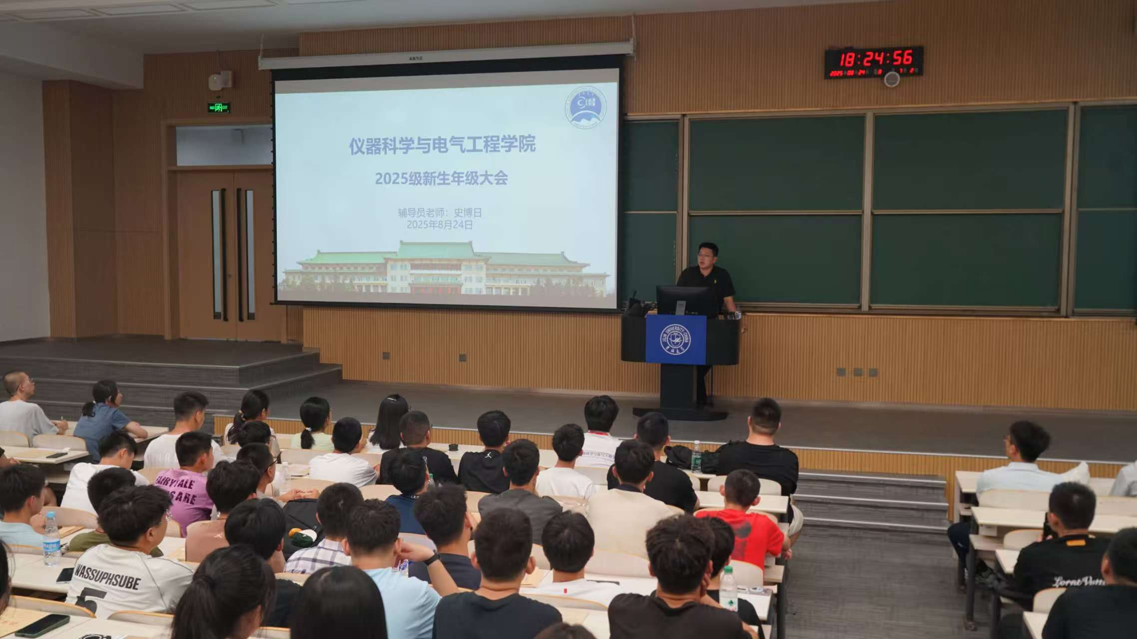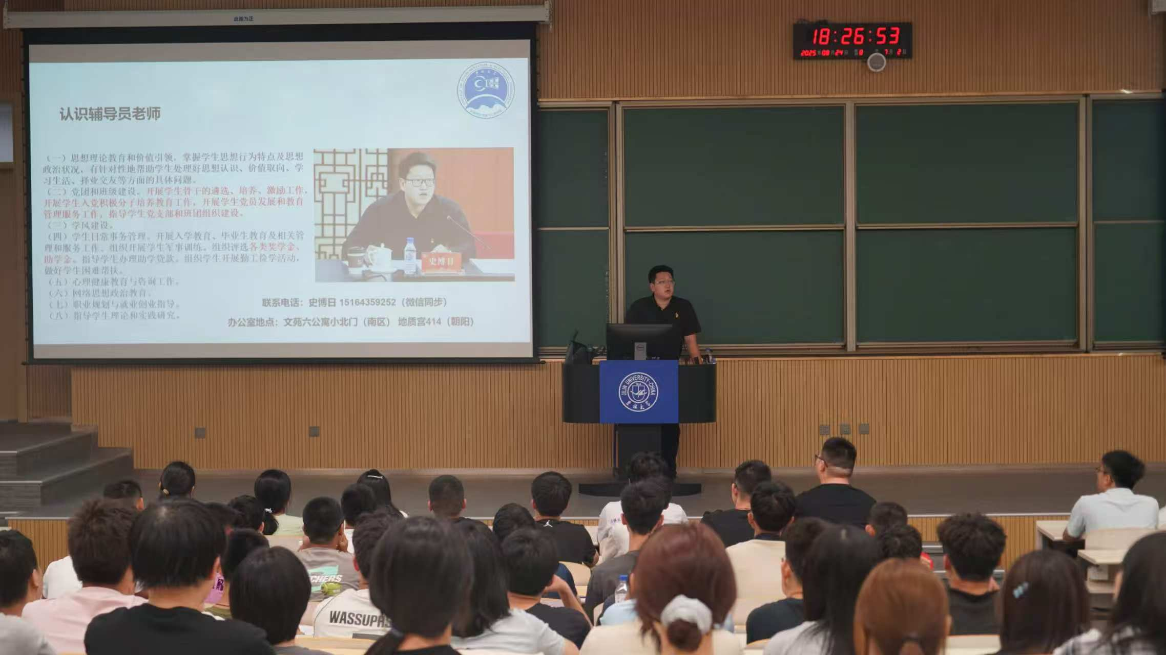 为助力2025级新生快速适应校园生活、明确学业规划,8月24日晚,2025级辅导员史博日老师在李四光楼主持召开新生第一次年级大会,全体2025级新生参会。