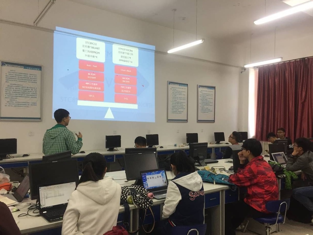 在本次培训中,周葛同学详细讲解了如何查stm32的芯片手册、如何使用stm32的寄存器以及如何使用stm32的库函数。首先讲解的是如何查stm32的芯片手册,这有助于同学们更好的根据自己的目标和要求合理地选择stm32芯片,以求在不浪费硬件资源的情况下达成目的;接下来讲解的是stm32的寄存器的使用,在周葛同学的引导下同学们查阅了stm32的技术手册,了解了每一个寄存器的初始化和使用的方法;最后讲解的是stm32的库函数的使用,尽管库函数使用方法有些抽象和难以理解,但同学们还是认真听讲并努力地尝试掌握。本期培训虽然长达两个多小时,同学们的学习热情却丝毫没有衰减。对于有疑问的同学,主讲人还时不时地停下来为他们解释。在学员与主讲人的默契配合与努力下,这次培训取得圆满成功。据反映通过这次培训,大二的成员基本掌握查阅芯片手册、使用寄存器和库函数的技能,为嵌入式系统的进一步的学习与应用打下坚实的基础。