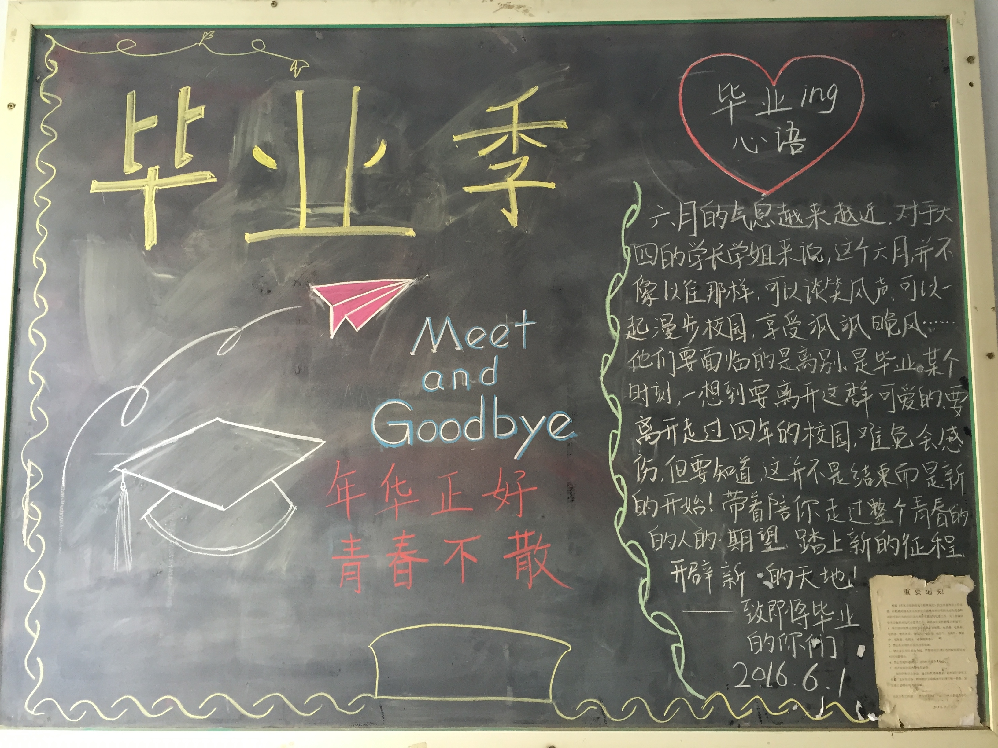 为迎接毕业季的来临,并为同学们创造优雅舒适的公寓环境,yl23455永利yl23455永利团委于2016年 6月1日15:00在朝阳校区一、二、五员工公寓开展了绘制“毕业季”主题黑板报活动,公司在校生代表参与了本次活动。