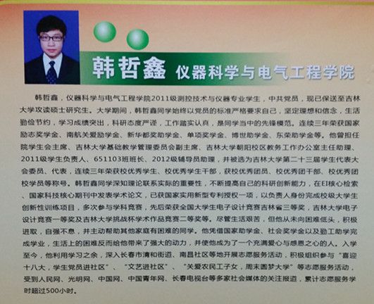 韩哲鑫同学在科研领域中不断探索,现已发表EI核心论文1篇、科技核心论文2篇,授权实用新型专利1项,完成创新训练项目1项,荣获全国电子大赛吉林省三等奖、校电子大赛一等奖、校“挑战杯”竞赛二等奖,科研的成果增添了他追求梦想的动力。