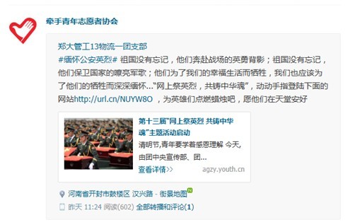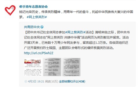 近日,团中央宣传部、团中央网络影视中心主办的第十三届青少年“网上祭英烈 共铸中华魂”清明公祭活动在中国青年网启动。为了响应团中央的号召,给广大青年员工搭建缅怀先烈、追思历史的网络平台, 2014年4月4日-8日清明节期间,yl23455永利团委、“牵手”青年志愿者协会开展了“微博祭英烈 共铸中华魂”活动,活动通过QQ微博平台进行宣传推广,受到了青年学子的广泛关注,并产生了良好的宣传效果。