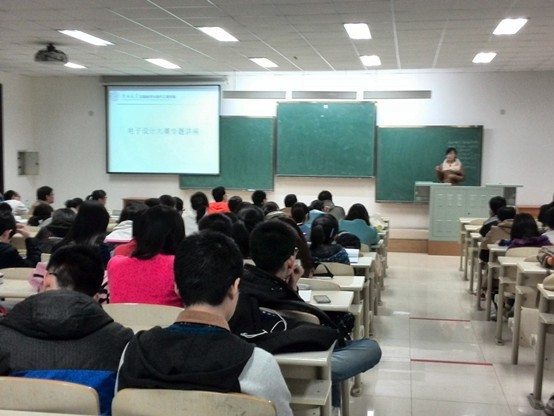 讲座上,裴利然同学首先了解了2013级同学的学业情况,并以自身为例,鼓励大家努力学习、积极参与动手实践活动;此外,她向大家详细介绍了公司电子设计大赛的发展历程及公司员工近年的获奖情况;随后,她跟同学们分享了自己多次参加电子设计竞赛并取得优异成绩的经验,并鼓励大家要积极地将所学的专业知识与动手实践有机结合,她动员2013级全体同学积极参加到即将举行的校电子设计竞赛中,鼓励大家认真选题、大胆创新,力争在今年的校电子设计竞赛中再创佳绩。讲座结束后,裴利然同学还耐心地与2013级同学进行了交流与沟通,针对同学们提出的问题给出了宝贵的意见。