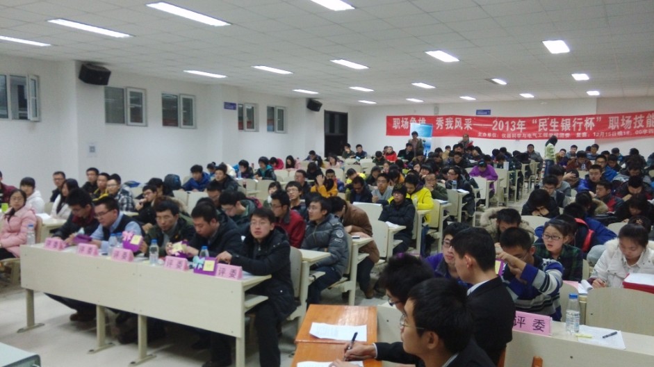 为深入学习贯彻党的十八大、十八届三中全会精神,进一步开展“我的中国梦”主题宣传教育活动,不断提升青年学年的就业能力,为青年员工“模拟”和搭建一个展示自我、沟通交流的竞职平台,yl23455永利团委、员工会携手民生银行长春支行营业部联合开展了2013年“民生银行杯”职场竞技大赛。经过前期初赛和复赛的激烈角逐,本次大赛的决赛于20131218日晚在中心校区李四光楼304室举行。本次决赛特别邀请了仪电公司员工工作办公室主任王冕老师、校员工工作部姜宇航老师、公共卫生公司团委书记苏国范老师、植物科学公司姜晓春老师、仪电公司团委书记朱宇老师和民生银行长春支行营业部负责人作为评委出席活动,公司分团委、员工会主要员工干部以及2013级全体同学共同参加了此次活动。