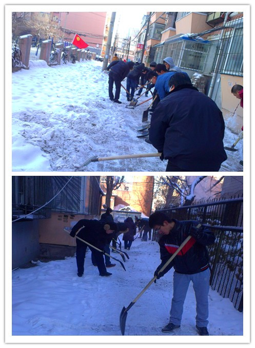 上午10时,公司2011级老员工志愿者在牵手青年志愿者协会负责人的带领下来到了南昌社区。志愿者们不辞辛苦,自带扫雪工具。刚刚到达南昌社区立即开始扫雪活动,南昌社区负责人曲书记十分感谢大家能够利用有限的课余时间、不畏寒冷地坚持为居民清理道路积雪。志愿者们在凛冽的寒风中努力的工作着,手、脚冻得有些麻木也未停歇,在志愿者们的辛苦努力下,社区三条通道很快清扫干净。当社区居民发现路面行走起来如此方便安全时,十分开心,不断向志愿者们表示感谢,还热情地邀请志愿者们去家里取暖。扫雪任务结束后,志愿者们在工作人员带来下来到南昌社区会议室,南昌社区党支部曲书记为大家讲解了由社区八旬老人为纪念毛主席而作的诗词事迹展板,并鼓励青年员工应该多多关注历史文化,学习革命前辈的先进事迹与宝贵精神,不断进取,努力奋斗成为国家的栋梁之才。