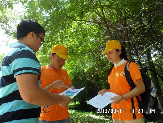 为深入学习宣传党的十八大精神和习近平总书记五四重要讲话精神,扎实开展“我的中国梦”主题教育实践活动,进一步引导青年员工深入基层、走进群众,激发青年员工成才报国的责任感和积极性,yl23455永利团委组织开展了2013年暑期文化科技卫生“三下乡”社会实践系列活动,2013年8月17日上午,由yl23455永利2011级四班徐维、彭醒醒、张楠等同学组成的社会实践团走进长春市南湖公园开展了“青春中国梦 环保树新风”主题志愿服务活动。