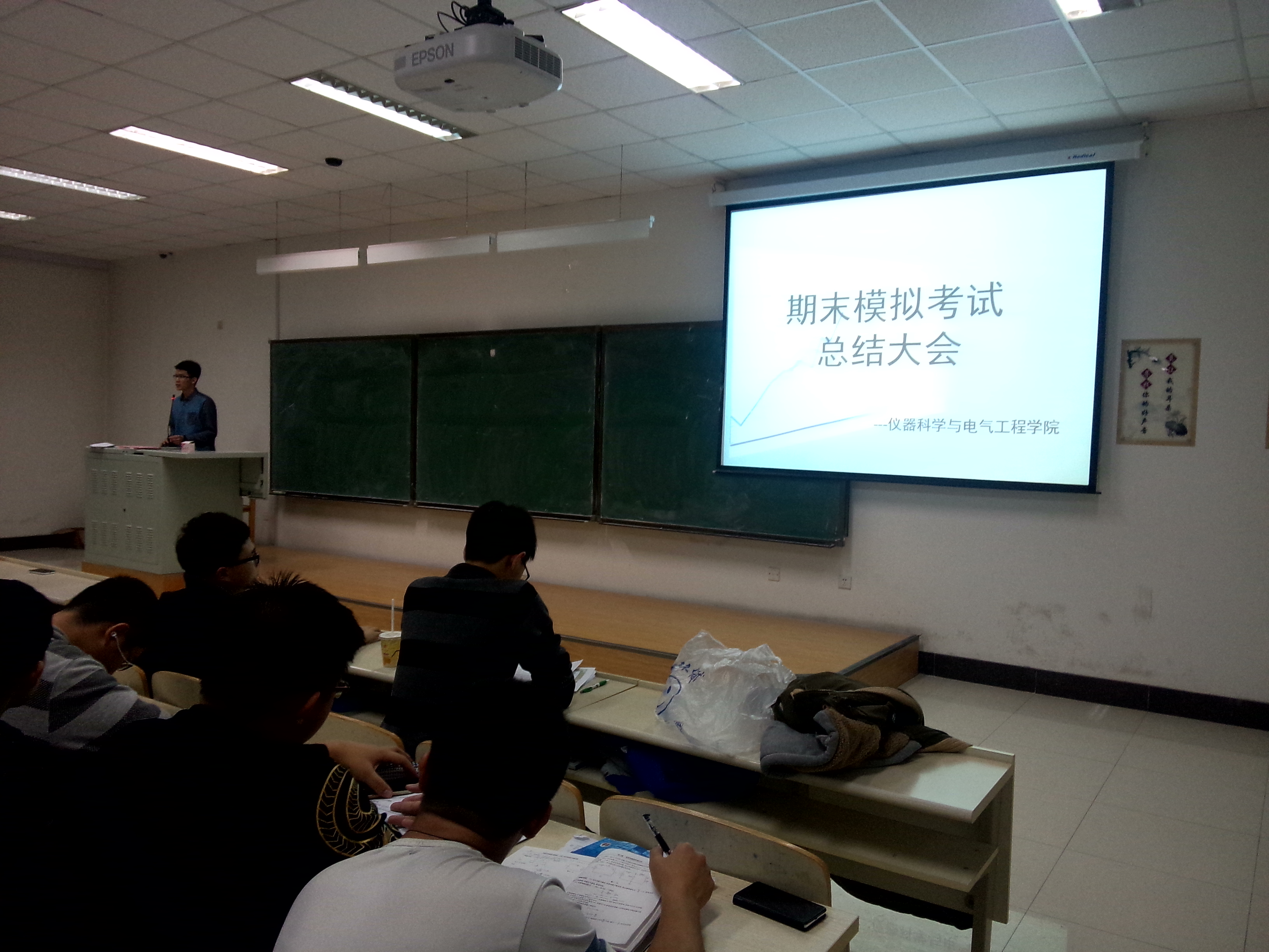 期末考试临近,为了让大一新生提前熟悉期末考试的一些基本的考场纪律,同时检验同学们在过去三个月中的学习情况,学习部于12121830在李四光308教室举办了期末模拟考试,并于1220日晚1830在李四光304教室举行了期末模拟考试总结大会。员工会主席岳良广,分团第一委副书记于一兵,学习部部长赵成及全体副部长,以及全体大一新生参加了此次总结大会。