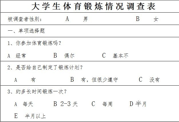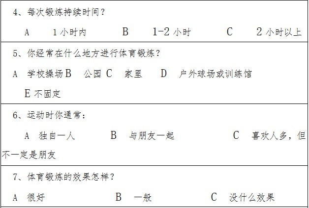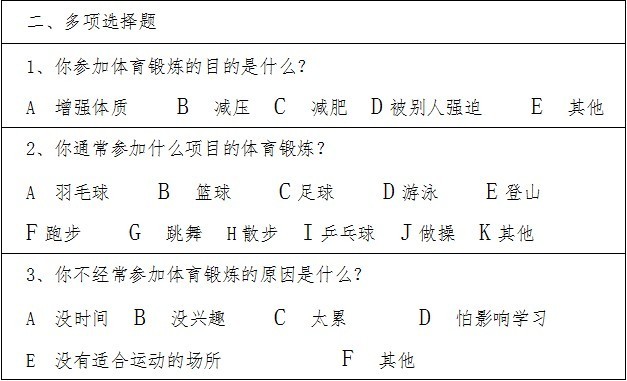 从调查结果可以看出,普遍受欢迎的体育项目是篮球、足球、羽毛球和跑步。但是大部分同学没有自己的体育锻炼计划,很多都只是随机安排自己的体育锻炼活动。对于参加体育活动的目的,同学们认为主要在于增强体质,同时也有为了缓解压力和减肥等。从这次征集活动中,我们还了解到在体育锻炼方面,女生的参与度相对落后于男生,建议广大青年女同学在未来的老员工活里积极参加课外活动和体育锻炼,增强体质。