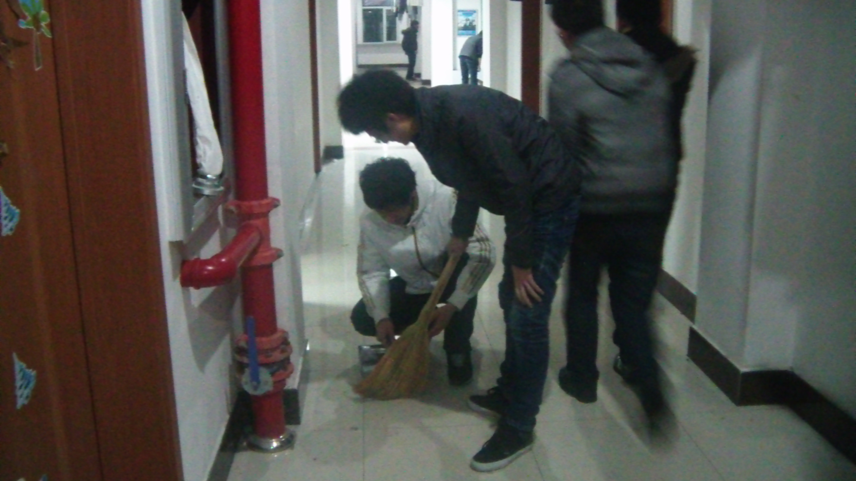 3月10日上午,趁着周六假期休息时间,2011级一班同学在班级团支部的组织领导下,以寝室为单位,帮助宿舍保洁阿姨打扫寝室公共卫生。同学们对走廊进行了清扫,对热水房的暖瓶进行整理,并对清洁洗手间的洗漱台进行了清理等。