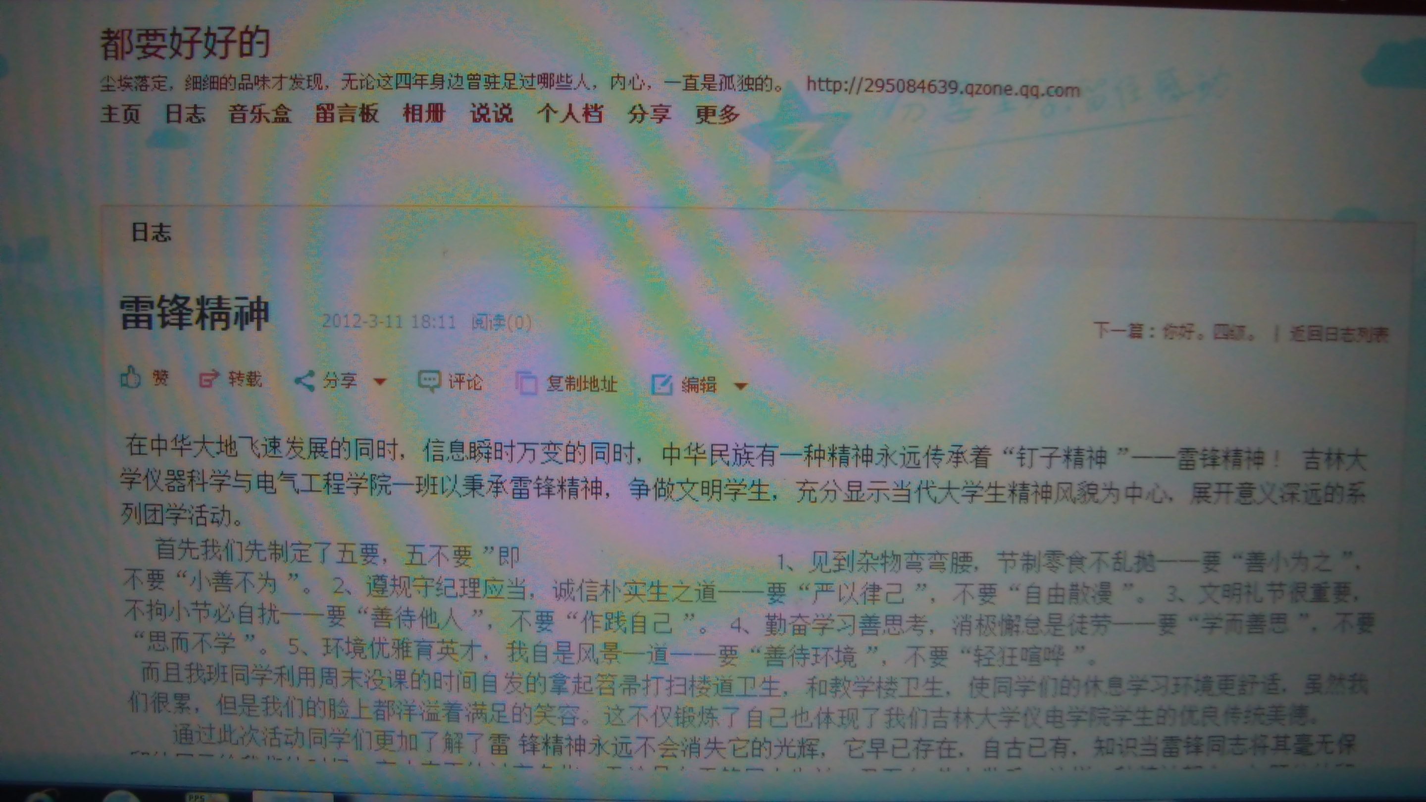 3月11日晚,2011级一班班委在QQ空间、人人网等新媒体上发表了学习雷锋精神的有关文章,班级同学积极参与转发,希望感染身边更多的人学习雷锋,继承雷锋同志的奉献精神,参与到学习雷锋活动中,努力承担起对公司、对社会的责任和义务。