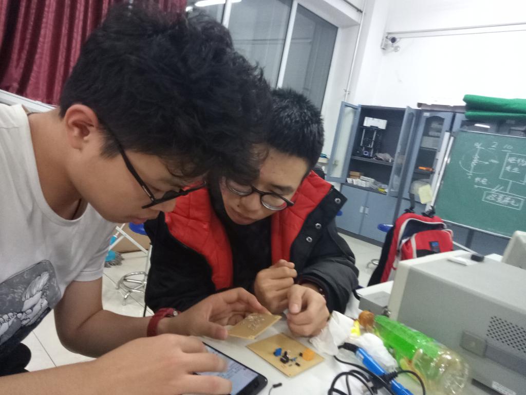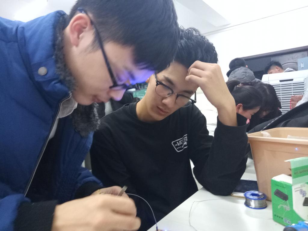 本次培训采用讲为主、做为辅的模式。培训开始,首先由科协副会长2015级张博森同学为2017级同学讲解电路基础知识。2017级同学们认真听学长授课,并互相讨论自己不理解的地方,交流意见,场面十分热烈。在听完张博森同学精彩详细的电路基础知识讲解后,2017级同学拿出在第五期培训焊好的电路板,交给在场的2015级和2016级相关负责人进行检查。他们使用万用表、示波器等工具来测试电路板能否正常工作,针对不能正常工作的电路板进行重点检查,检查出了许多问题,诸如断路、短路、电路板与电路原理图不符、芯片损坏等。最后相关负责人逐一为2017级同学讲解了他们电路板上存在的问题。2017级同学听完学长的讲解,不仅知道了自己的电路板的焊接问题,而且学会了应该从哪几方面去检查问题、如何排查问题。
