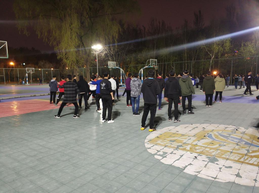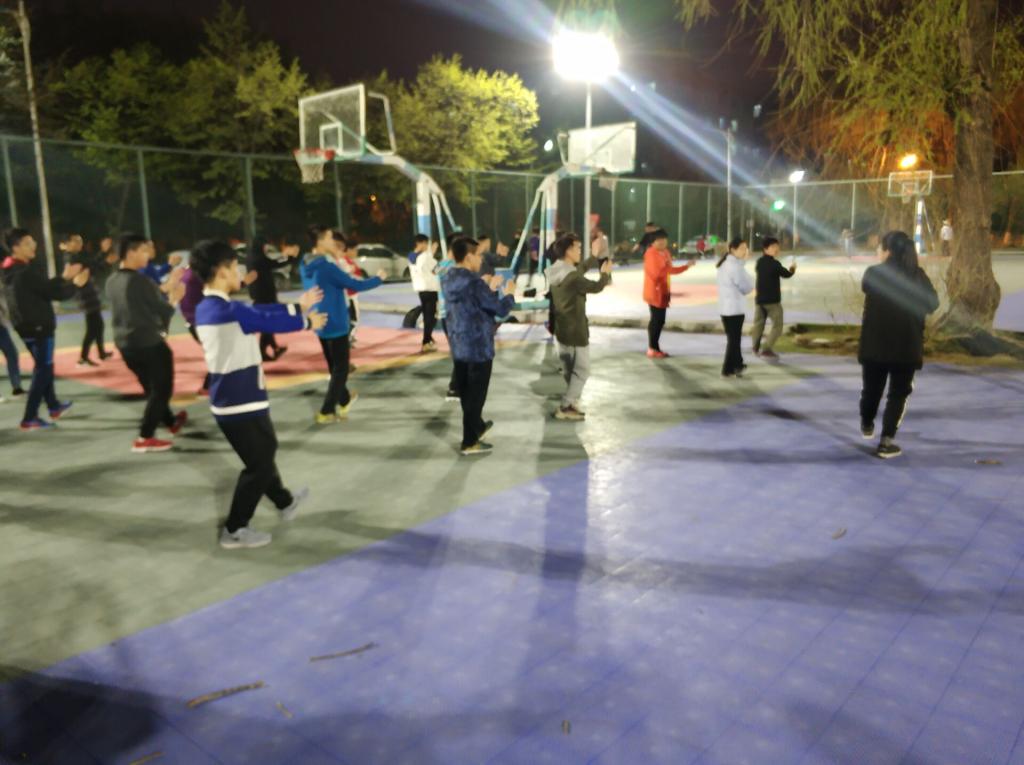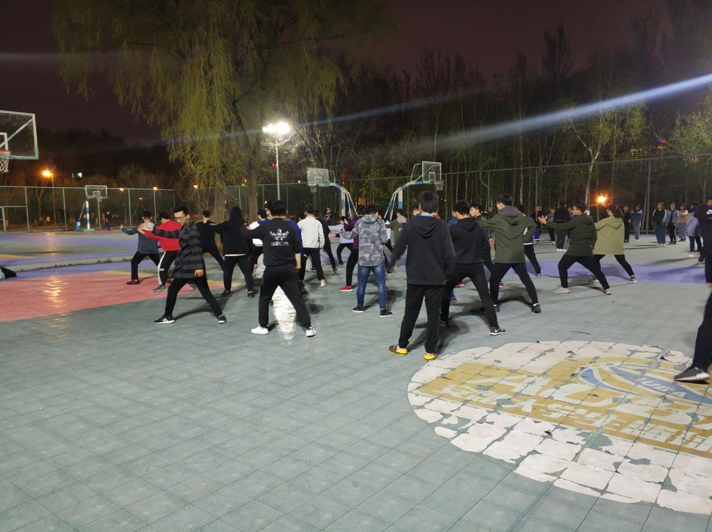 5月9日晚上9:00,仪电公司太极训练如期在行政楼篮球场展开,每一位太极方队的队员在教练宋雨鑫的指导与带领下连贯的学完了所有动作,并有条不紊地重复练习每一招一式以加深印象。在流畅、舒缓的音乐中,队员们的动作舒展,但节奏与队伍整齐度把握也待改善。每一位队员都全神贯注的训练,在教练的指导下调整自己每个动作,虽然现在的动作并不是十分完美,但大家的一招一式中都展现出了太极的柔和之美。