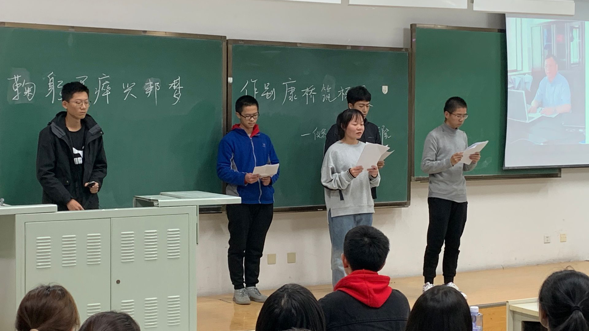 活动伊始主持人介绍了黄大年教授的生平与事迹,随后2020级同学以班级为单位派出代表通过诗朗诵与情景剧的方式展示了各班学习黄大年精神的学习成果。其中,有关黄大年教授的情景剧生动形象地体现出了黄大年教授鞠躬尽瘁的工作态度,引起了在场同学的强烈共鸣。活动过程中进行了关于黄大年教授的知识问答,宣传部为抢答正确的同学与最后评得奖励的班级准备了有意义的奖品。经过现场评委的打分,最终652004班荣获一等奖,652006班、651903班荣获二等奖,652007班、652005班、652002班、652001班荣获三等奖。活动最后,马姗姗老师进行了深刻的总结讲话,她对2020级同学展示的成果给予了肯定与鼓励,希望同学们在今后的学习生活中们要深刻领会习近平总书记指示精神,学习黄大年教授精忠报国、心有大我、刻苦钻研、勇攀高峰、淡泊名利、无私奉献的精神,为中国梦的早日实现积蓄磅礴力量。