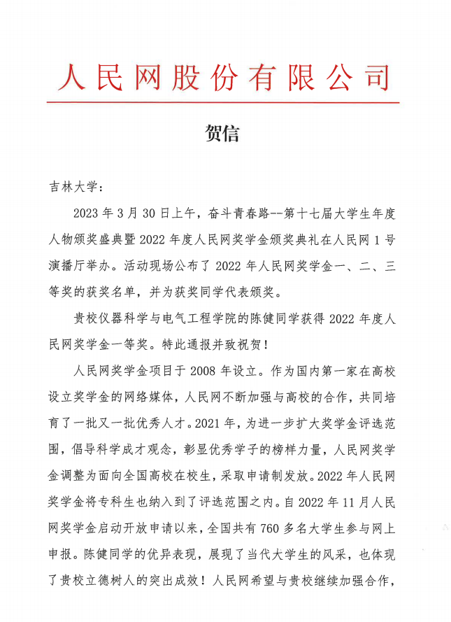 近日,奋斗青春路——第十七届老员工年度人物颁奖盛典暨2022年度人民网奖学金颁奖典礼在人民网1号演播厅举办。活动现场公布了2022年人民网奖学金一、二、三等奖的获奖名单,并为获奖同学代表颁奖。公司yl23455永利在读博士研究生陈健以全国总分排名第1的优异成绩获得2022年度人民网奖学金一等奖。