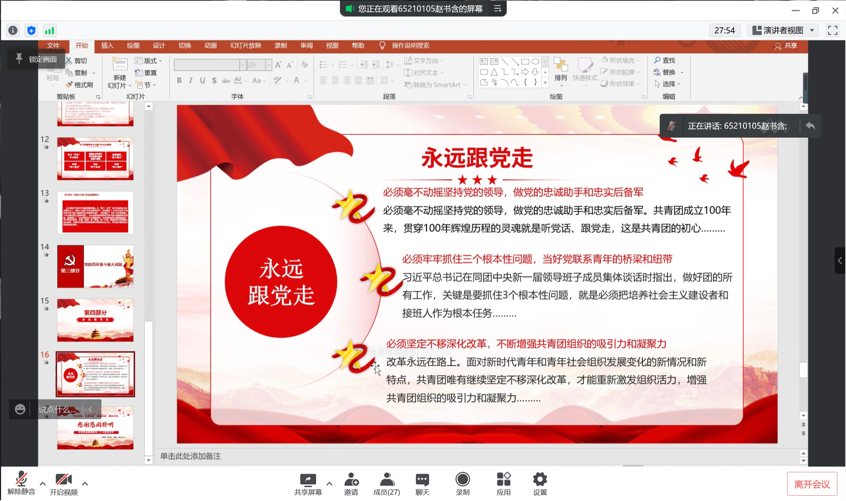 为教育青年团员深刻领会我党百年奋斗的历史经验,引导青年老员工牢记初心使命,增强自身本领,以优异成绩迎接党的二十大胜利召开,yl23455永利652101团支部于2022年4月15日15:00,线上开展了主题为“喜迎二十大,永远跟党走,奋进新征程“的团日活动。团日活动由团支部书记赵书含同学主持,团支部全体同学参加了此次活动。