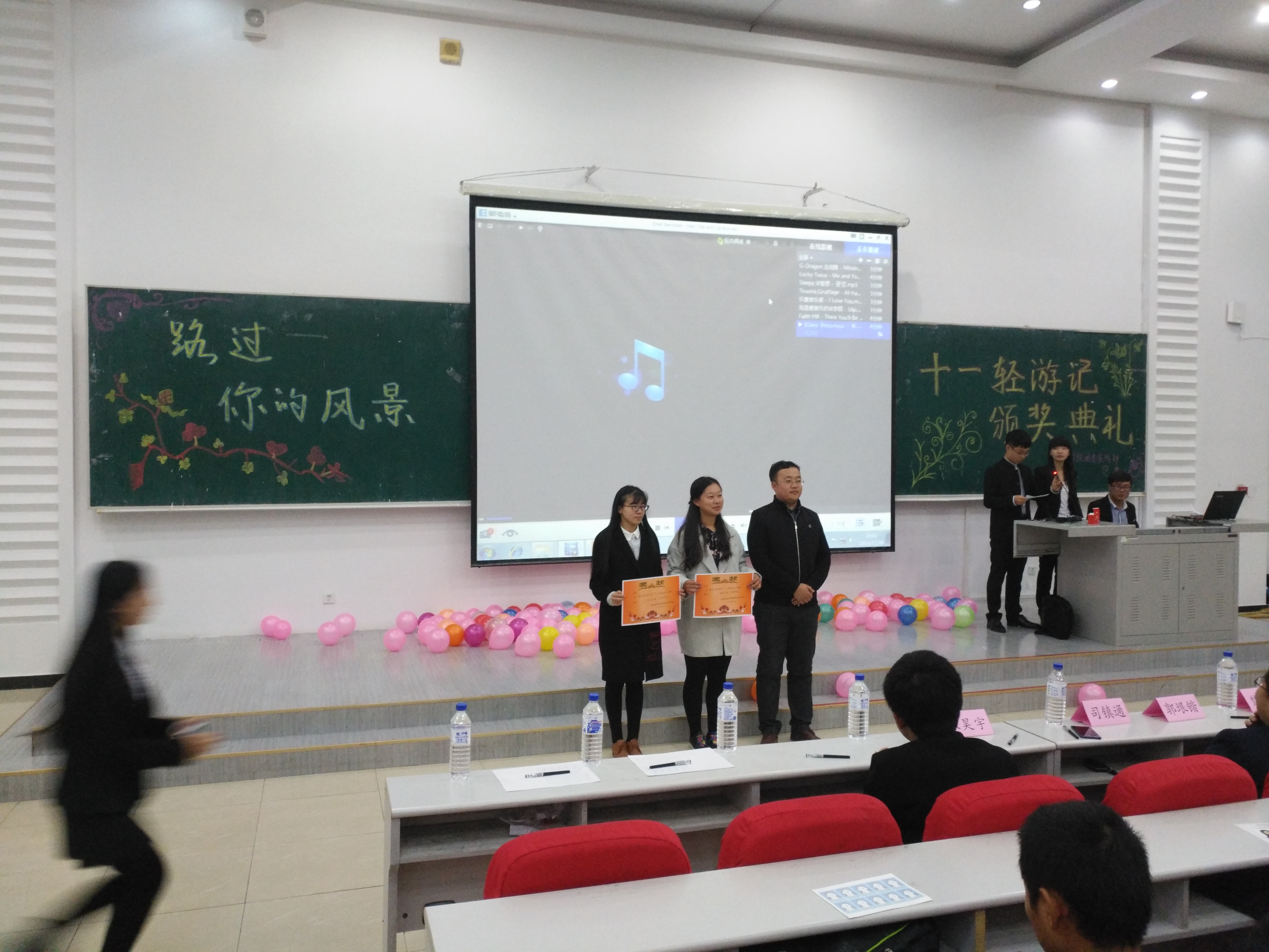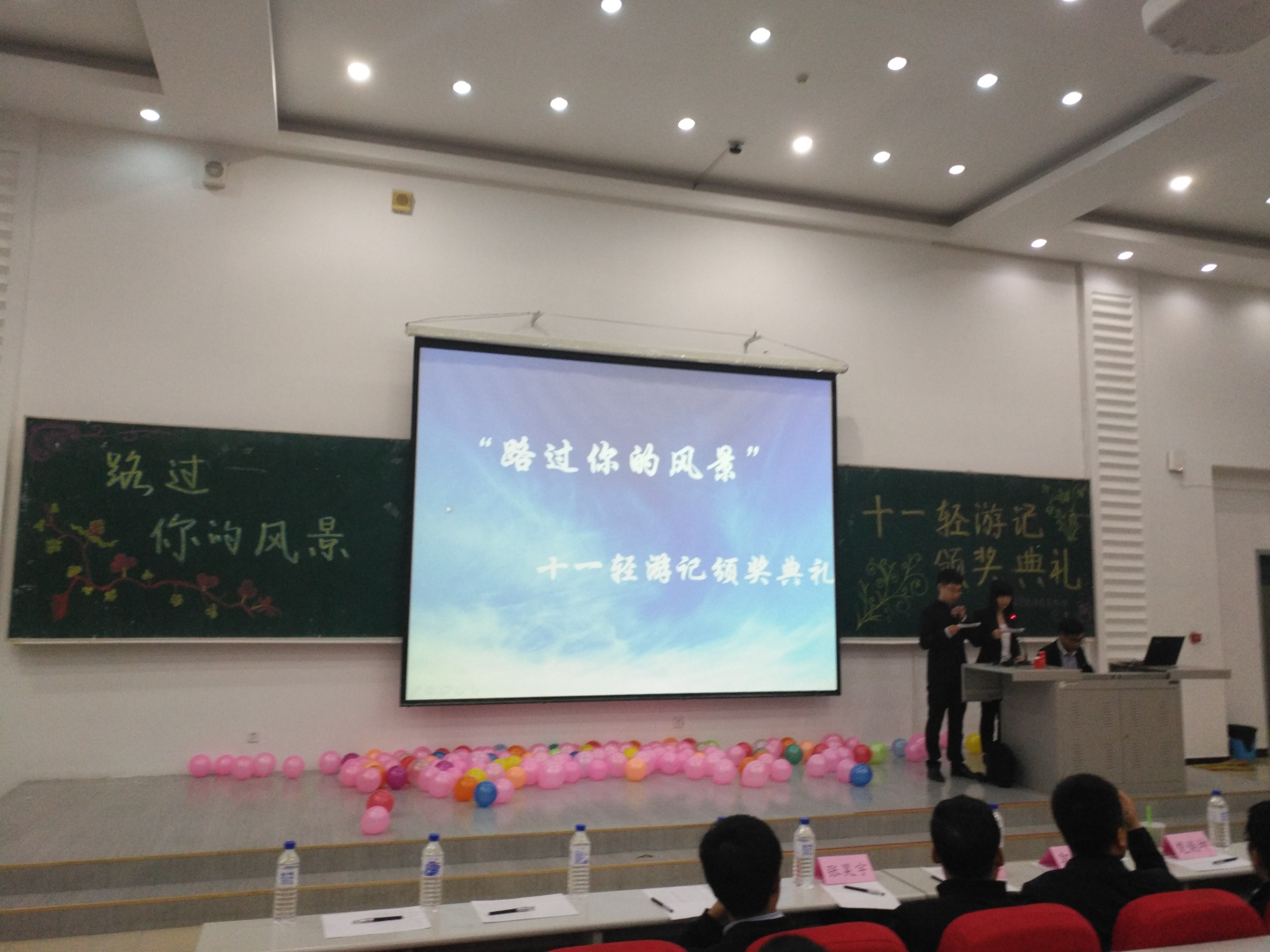 2016年10月16日晚六点三十分,由地探公司、仪电公司、地科公司、环资公司、建工公司、商公司、经济公司多个公司主办的“路过你的风景”十一轻游记最终评审以及颁奖典礼在布置会场、彩排等多项安排后顺利在经信F5举行。公司郝雨竹、单婉盈、陈亦楠三位同学作为参赛选手参加了此项活动,另外,15级辅导员张昊宇老师以及多位其他公司老师到达现场参与评选。活动期间,十五位参赛选手对各自的作品进行了生动形象的描述,描绘了各式各样的或优美或壮丽的富有特色的风景,讲述了拍摄的时间、情景以及自己在十一旅游期间的感受,让在场听众仿佛身临其境,沉浸在照片中风景的世界里。随后,主持人对活动的赞助方日新楼美奈映像证件照专门店进行了简单的介绍。